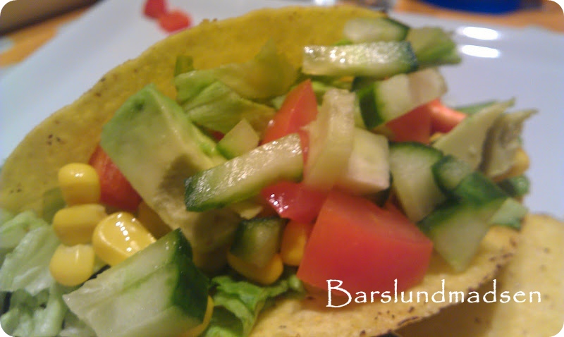 Maden bestod af tacoskaller med fyld, fyldet var skåret i små stykker og delt ud i en masse små skåle, lige noget de små fingre syntes om, og der blev virkelig gået til den, sjældent har jeg oplevet at der blev spist så meget grønt... Det er ikke første gang vi får det at spise, men det er første gang at alle 3 unger syntes det er så sjovt som de gjore idag.